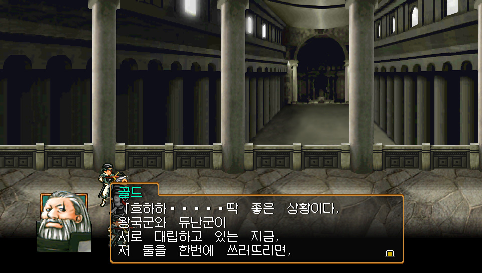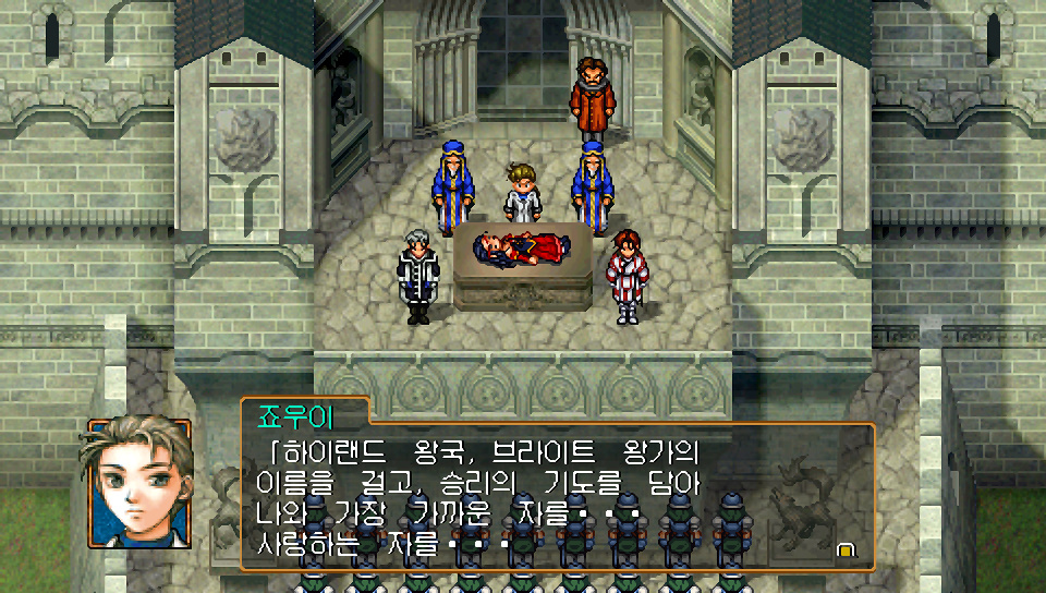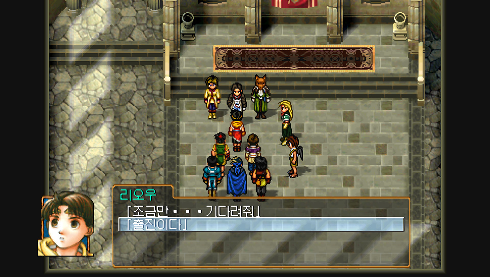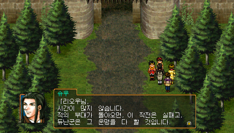 슈우 : 리오우님. 왕국군은 뮤즈를 버리고 하이랜드로 철수했습니다. 그린힐과 마틸다, 2방향에서 동시에 공격이 들어오면 막아낼 수 없을거라 판단했겠지요. 하지만 체제가 재정비되면 다시 공격해 올 것임은 확실합니다. 듀난군의 군사로서 조언을 드립니다. 지금이야말로, 하이랜드를 공격해 모든 분쟁의 씨앗을 근절해야 합니다.