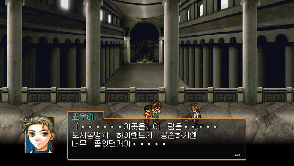 죠우이 : ...이곳은, 이 땅은... 도시동맹과 하이랜드가 공존하기엔 너무 좁았던거야... 그것이, 많은 싸움과 슬픔을 낳았다. 죠스톤 언덕에서, 도시동맹의 회의를 봤을때 내 마음에는, 커다란 의문이 생겨났어... 어깨를 맞대고, 어떻게든 살아가기 위해 이루어진 도시동맹의 안에서조차, 분쟁, 질투, 시기가 소용돌이 치고 있다. 나는 이 땅에 하나의 거대한 국가를 세울것이다... 왕국군도 도시동맹도 상관없어. 강력하고 강대한 힘을 가진 단 하나의 국가야말로, 이 땅에서 싸움을 없앨 수 있는 유일한 방법이다...