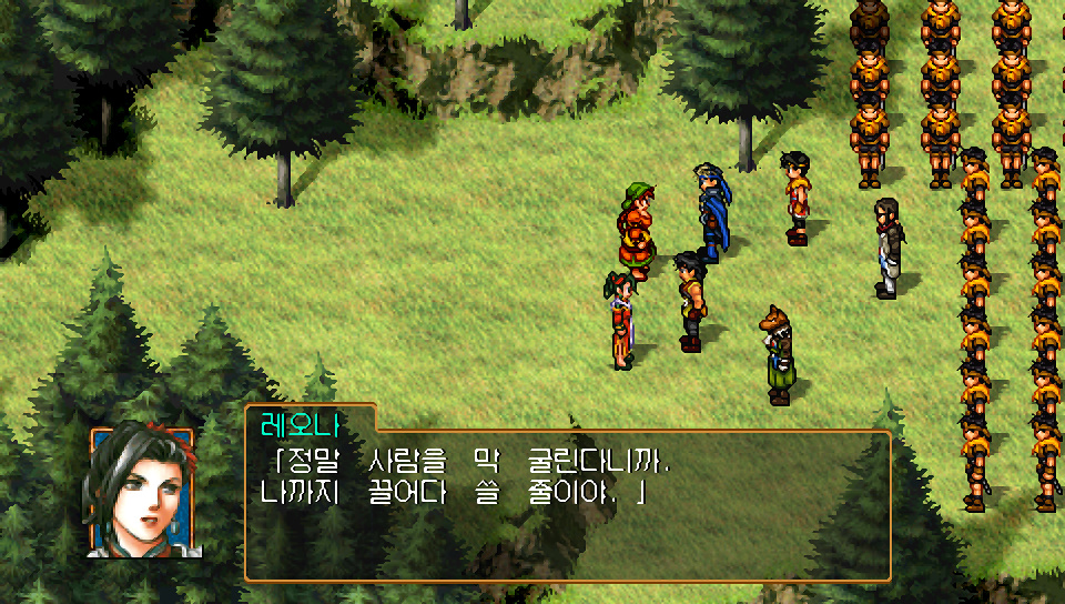 슈우 : 하이랜드 왕국과 도시동맹은 서로 세력이 너무나 커졌습니다... 북쪽엔 하르모니아 신성국, 남쪽엔 트란 공화국이라는 대국, 동쪽엔 대양이 펼쳐져 있고, 서쪽엔 황폐해진 글래스랜드... 이 땅에서 살아남기 위해선 싸움 이외의 길은 없었던 것입니다. 그것은 역사가 증명하고 있습니다. 사람의 지혜에는, 한계가 있는 법입니다. 리오우님. 하이랜드 침공의 명을 내려주십시오.