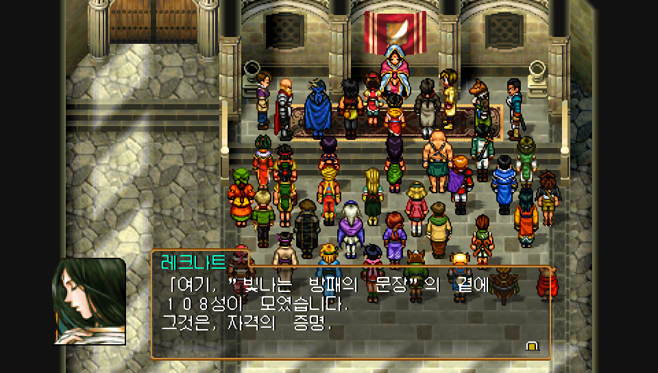 레크나트 : 리오우... 그대 주변에 이렇게나 많은 동료가 모였습니다... 그대 오른손의 "빛나는 방패의 문장" 과 죠우이가 지닌 "검은 칼날의 문장" 은 "시작의 문장" 의 두가지 상입니다. 그 힘은 싸움을 판가름 하는 힘. 의를 행하는, 외롭고, 냉정한 힘입니다. 그리고 그대에겐, 그 힘을 다룰 자격이 있습니다. 여기 "빛나는 방패의 문장" 의 곁에 108성이 모였습니다. 그것은, 자격의 증명. "빛나는 방패의 문장" 의 봉인을 푸는것이 가능해졌습니다. 오른손을... 리오우... 108성이여. 마음을 하나로, 리오우에게 새 힘을 부여하소서... 이걸로 이 문장의 궁극의 힘을 사용할 수 있게 됐을 것입니다. 리오우, 그대가 가는 길에 영광이 있기를...