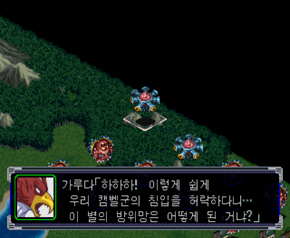가루다 : 하하하! 이렇게 쉽게 우리 캠벨군의 침입을 허락하다니... 이 별의 방위망은 어떻게 된 거냐? 이 정도라면 지구의 군대도 뻔하겠군! 그런데... 초전자 에너지라는 것을 연구하고 있는 곳은 저 기지 같은 건물을 말하는 건가...? 좋아, 저 건물을 공격해라!!
