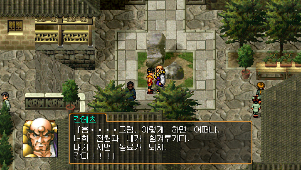 간테츠 : 흠... 그럼, 이렇게 하면 어떠냐. 너희 전원과 내가 힘겨루기다. 내가 지면 동료가 되지. 간다!! ...호오, 이거 놀랍구만!! 이 간테츠를 이길 줄이야!! 좋다, 약속이다. 동료가 되지.