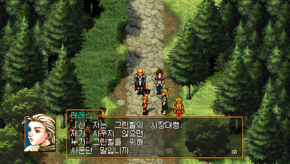 테레스 : 리오우님, 그린힐에는 옛 전투때 냈던 샛길이 다수 남아있습니다. 여기서 도망쳐나왔던 길도 그 중 하나. 그걸 이용해서, 적에게 들키지 않게 소수로 잠입해, 정문을 안에서 열도록 하죠. 안에선 제가 안내하겠습니다.