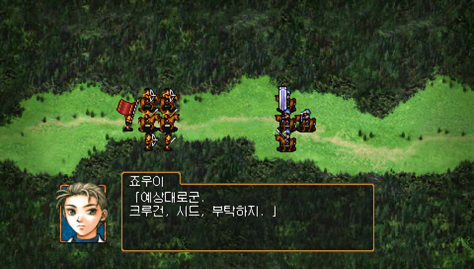 슈우 : 여기서도 안심 할 수 없겠군. 경비를 굳건히 하지. 리오우님, 그린힐 해방을 위한 준비는 다 갖춰졌습니다. 이번 작전엔 군을 둘로 나누겠습니다. 하우저 장군과 빅토르, 프릭은 뮤즈와 그린힐 국경으로 출진, 뮤즈에서 오는 왕국군을 저지해라. 그틈에, 키바 장군과 크라우스는 그린힐을 공략해주시길. 애플은, 이 성에 남아서, 두 군대의 연락책을 맡아라. 리오우님, 괜찮으시다면 출진 신호를 부탁드립니다.