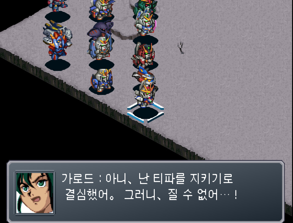 팀프 : (이 녀석... 가리아의 이노센트에게 원한이라도 갖고있는 건가?) 그럼, 새로 데려온 벌쳐를 소개해두지. 이 녀석들은 모빌슈츠 탑승자인데... 기체는 건담이다.
