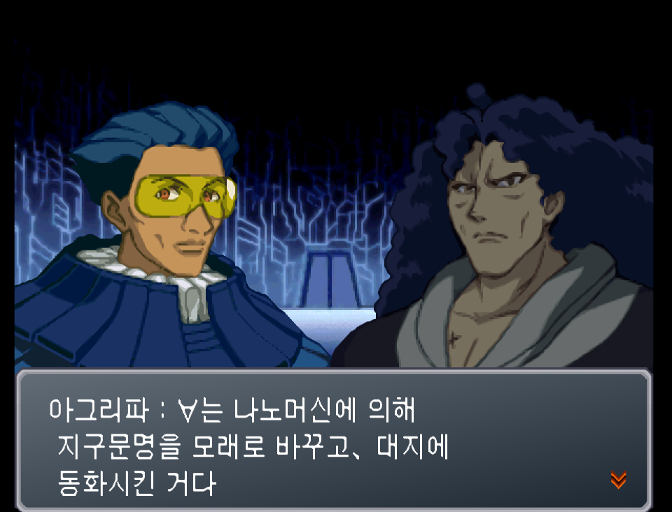 아그리파 : 그래. ∀는 우리들 선조들과 마찬가지로 나노머신을 지구상에 뿌린 거다. 단, 우리들과 결정적으로 다른 것은 그 목적! 우리는 나노머신에 의해 지구환경을 재생하려고 했으나, ∀는 나노머신에 의해 지구문명을 모래로 바꾸고, 대지에 동화시킨 거다.