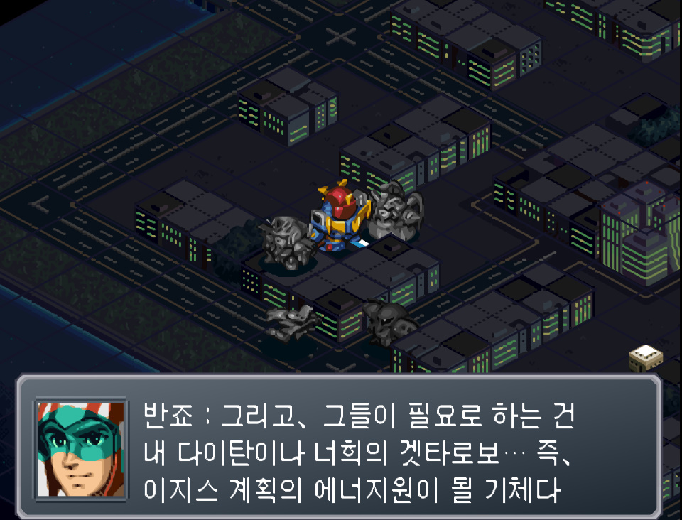반죠 : 현 시점에서 DC 일본지부를 그들에게 빼앗겨도 지장은 없어... 계획이 실행되는 건 여기가 아닌 달이니까. 그리고, 그들이 필요로 하는 건 내 다이탄이나 너희의 겟타 로보... 즉, 이지스 계획의 에너지원이 될 기체다. 그러니, 우리의 탈출은 그들에게 안좋은 상황이 돼. 설마, 여기서 DC 일본지부를 버릴 거라고는 생각지 않을 테니까. 그리고, 티탄즈는 달의 마이크로웨이브 송신시설의 제압도 꾀하고 있을 거다. 그걸 어떻게든 저지하지 않으면 안 돼.