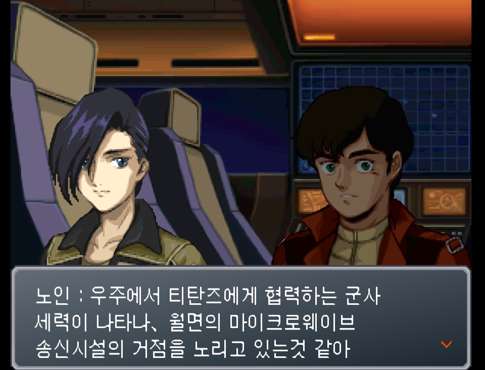노인 : 우주에서 티탄즈에게 협력하는 군사세력이 나타나, 월면의 마이크로웨이브 송신시설의 거점을 노리고 있는 것 같아.