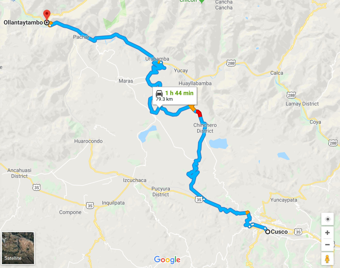 일단 지도부터 볼까요? 마추픽추까지 가려면 쿠스코에서 우선 올란타이탐보(Ollantaytambo, 오얀따이땀보가 실제 발음입니다.)까지 가셔야 합니다. 여기까지는 지도에서 보듯이 차로 두시간 정도 가면 됩니다. 택시를 대절 하셔도 되고 버스를 타셔도 됩니다. 중간 중간에 볼 거리가 많으니 (Cinchero, Moray, Salinas de Maras 소금 광산 등등) 반나절에서 한나절 정도 여유있게 가시면 좋겠습니다.