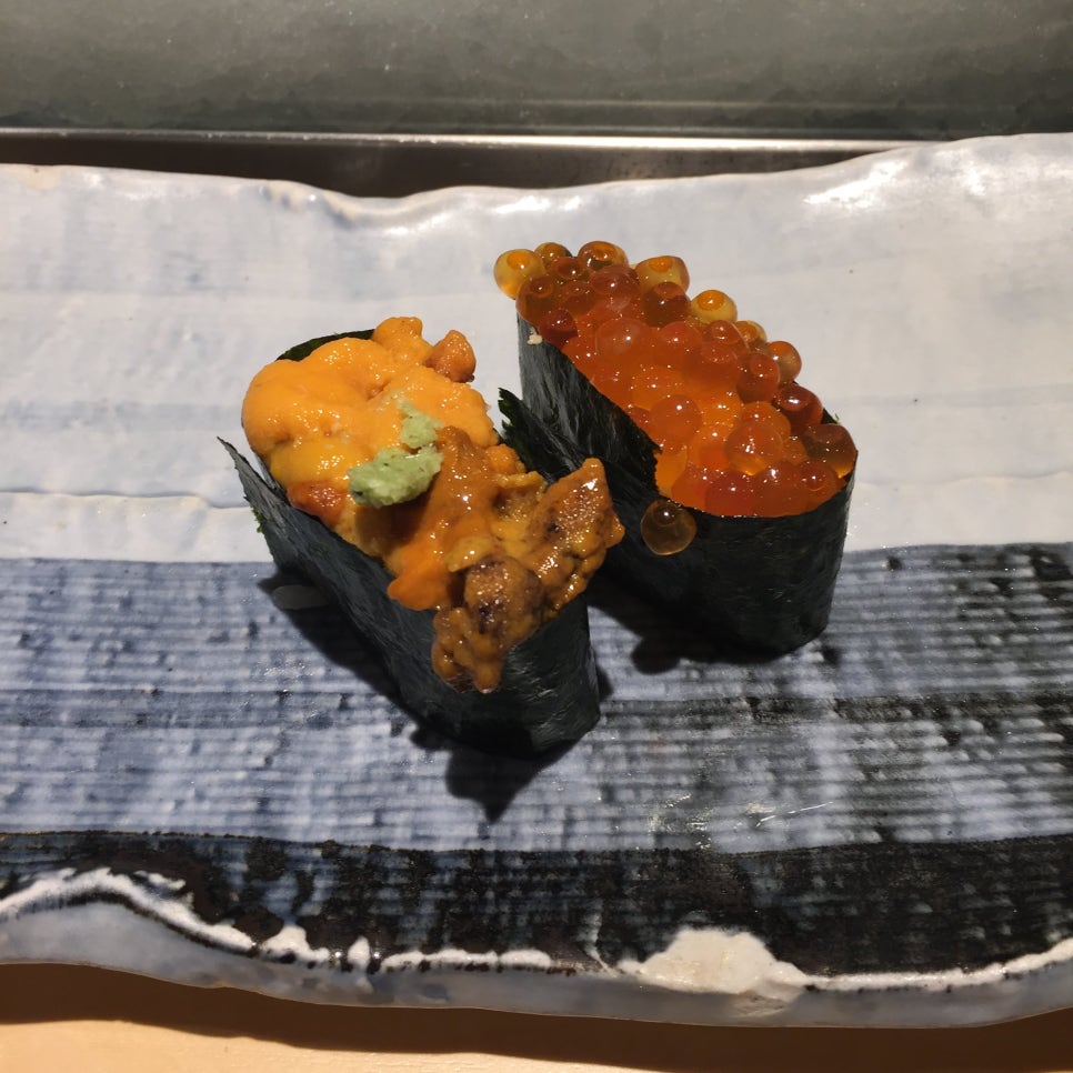 초밥집의 퀄리티를 따지는 척도 몇 가지가 '우니가 군함으로 나오는가 그렇지 않은가', '초새우가 나오는가 그렇지 않은가', '연어초밥이 나오는가 그렇지 않은가'인데 전자의 경우는 하급으로 친다. 물론 연어는 스테이크 같은 것보다 초밥으로 해먹었을 때 가장 맛있지만 '퀄리티 있는 오마카세 초밥집'에서 내놓을 만한 물건은 아닌 것이다. 연어초밥은 기계초밥으로 먹어도 괜찮은 그런 아이다. 우니가 군함말이로 나오는 것은 매우 보편적이다. 우니는 명반 처리를 해서 유통함에도 재료의 특성상 무너지기 쉽기 때문에 샤리 위에 올리기가 어렵고, 때문에 김에 말아 먹기 편하게 만든 것이 일반적이다. 하지만 좋은 김의 향은 우니의 농후한 풍미를 방해하기 때문에 사실 김과 우니는 따로 먹는 것이 좋다. 때문에 좋은 스시집들은 우니를 따로 내놓는다. 밥 위에 살짝 올리거나 손 위에 스시를 올려주는 식으로 해서 말이다. 하지만 역시 1,600엔이라는 가격엔 우니와 이쿠라가 나온다는 사실만으로 감동이다.