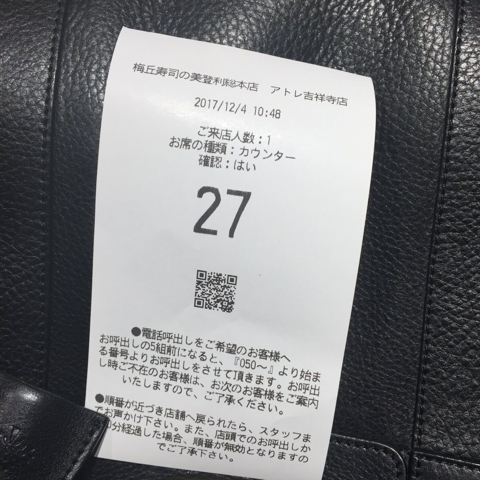 가려는 스시집은 키치죠지 역과 연결된 쇼핑몰 아트레 지하에 있다. 쇼핑몰 식당이 평이 좋길래 반신반의 했지만 타베로그에서 3.5점이 넘으면 먹을만한 집이라는 믿음을 가지고 갔다. 11시 오픈이었는데 10시 50분에 가게 앞에 도착, 번호표를 뽑았더니 27번이었다. 과연 맛집인가 보다.