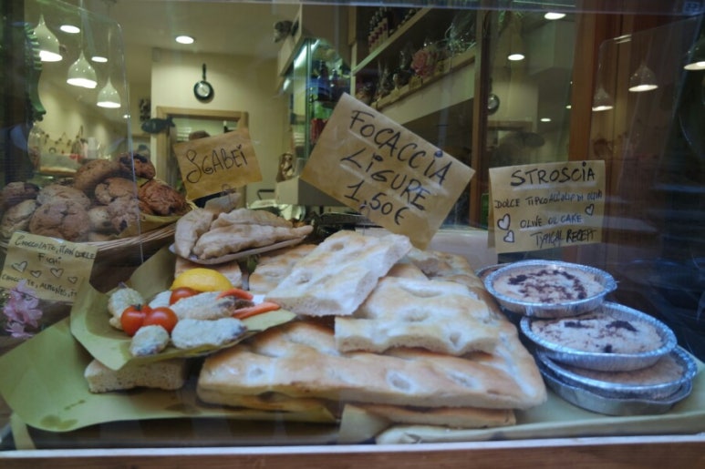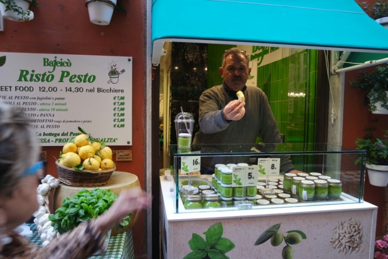 포르토베네레에서 유명한 가게 중 하나입니다. 바질 페스토를 파는 가게인데요. 우리 나라에서는 많이 안 먹지만, 유럽에서는 정말 많이 먹는 것 중에 하나이죠. 바질 잎과 다진 마늘, 소금 그리고 치즈를 잘게 갈아서 만들게 됩니다. 이 가게에서 파는 페스토는 치즈를 듬뿍 넣어서 풍미가 있는, 매우 깊은 맛을 느낄 수 있습니다. 시식해보라며 빵에 페스토를 찍어서 주십니다.