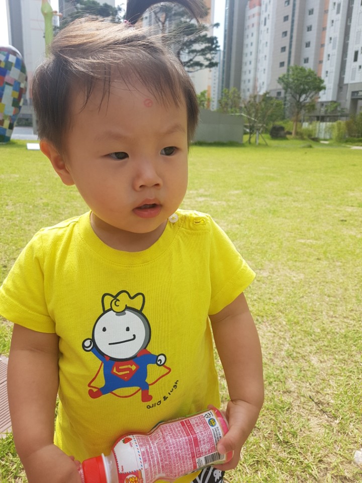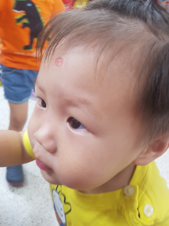 둘째는 아빠랑 들어가더니 이마에 인증도장찍고 나왔네요?ㅋㅋㅋ