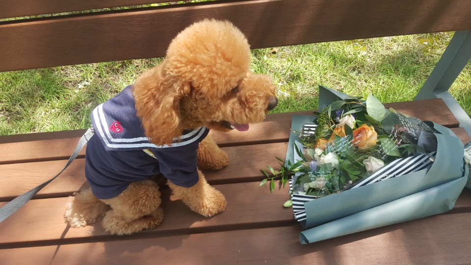 귀여운 마린룩입고 꽃앞에 얌전히 앉아있는 도도-
