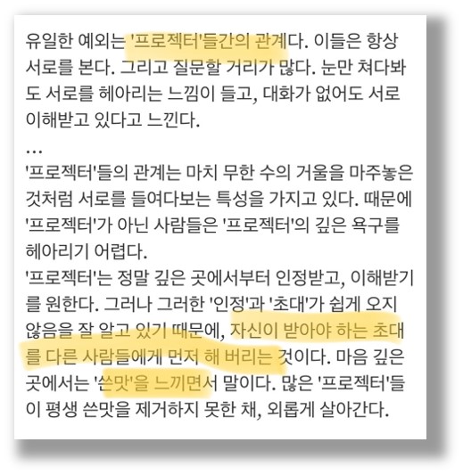 사람과 사람사이의 어떤 관계는 저에게 항상 고민거리였고, 지금은 어느정도 요령이 생겼지만 그래도 힘든 일입니다. 자존감이 낮은 저에게 인간관계는 너무 어려웠습니다. ‘내가 너의 이야기를 들어주고 고민에 공감하며 해결책을 강구해주는데 왜 너는 그렇지 못하지?’ 를 수도 없이 반복했고, 지금도 빈도는 낮지만 자주 반복해요. 그런데 노섭타님의 글을 읽고 지금 생각해보니 저는 ‘프로젝터’가 아닌 다른 성향의 사람에게 내 이야기를 들어줄 것을 요구했을지도 모른다는 생각이 드네요. 즉 노섭타님의 설명글에서의 말에 따르면 '초대받지 않은 채' 관계에 참여한 셈이죠. 몇차례의 시행착오 결과 사람과 사람 사이에서 주는 대로 받겠다는 의지는 많이 사그라들었습니다. 상처는 받기 싫어서 내 진정한 이야기보다는 청자가 ‘듣고 싶어하는 이야기’, ‘흥미를 보일 것 같은 이야기’ 위주로 해왔어요. 그 과정에서 자존감은 다시 낮아지기도 했습니다. 지금은 정말 믿을 만한 소수의 사람들에게만 제 이야기를 하네요. 아니면 오히려 낯선 사람에게 제 이야기를 하거나요. 이렇게 온라인으로.