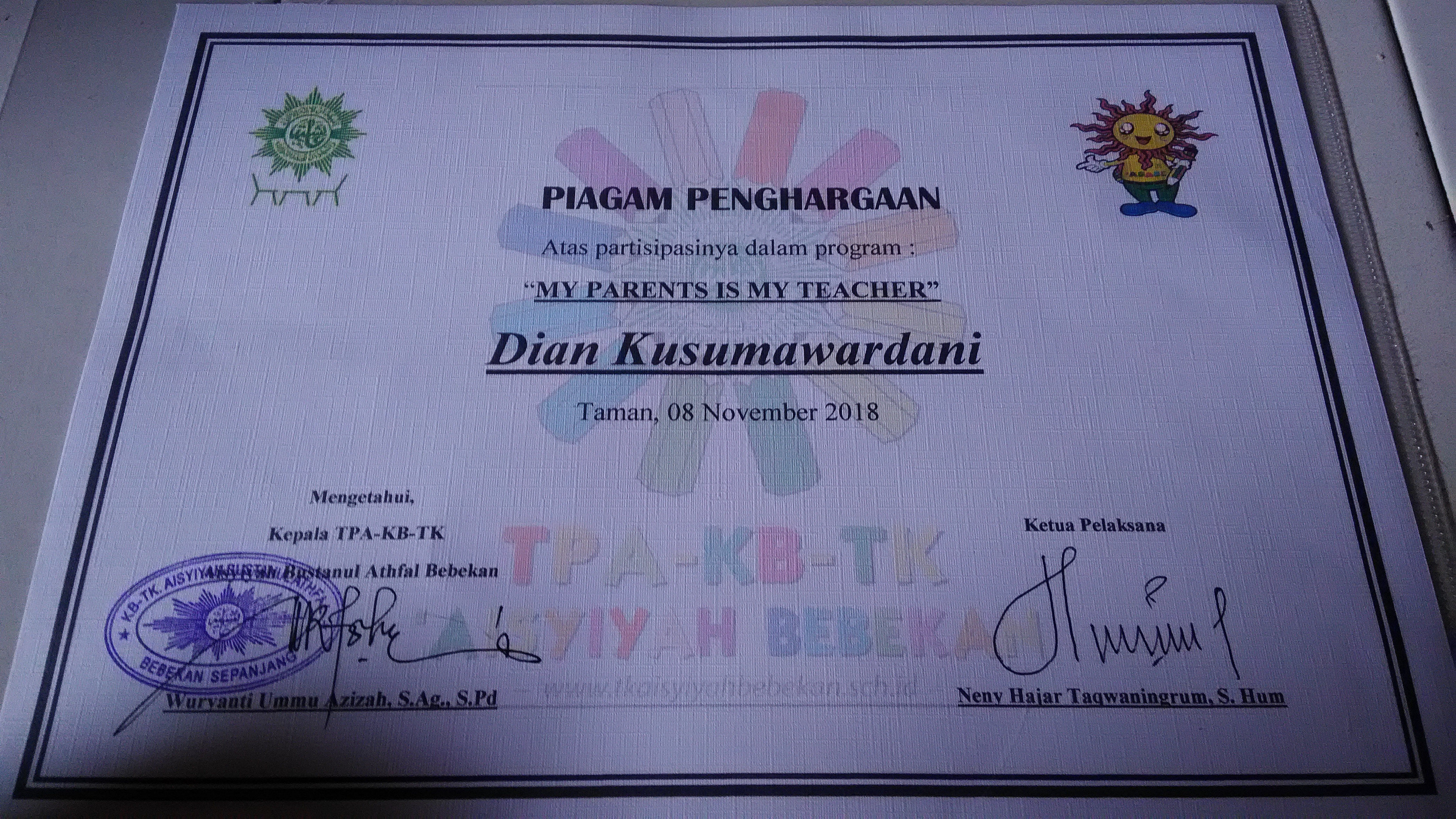 Di akhir acara, walimurid di beri penghargaan oleh sekolah. Bingkisan dan sertifikat.