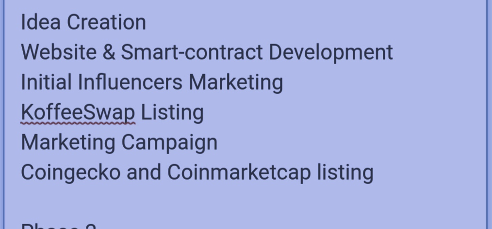 Liquidity Locked — The LP liquidity is totally locked on KoffeeSwap, each trade people make, 3% transaction fee will go to the LP, 3% is going to the holder, 2% will go to burn wallet, and 3% left will go to our promoting wallet.