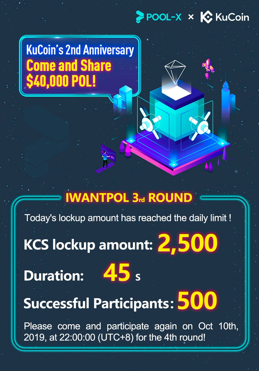 Pool-X Lockup Round 3 Ended Very Shortly because Of So Many KuCoin Users!dudin (27)in #kucoin2ndanniversary • 6 years ago Pool-X Round 4: https://twitter.com/pool_x_official/status/1179766419657019397 #poolx