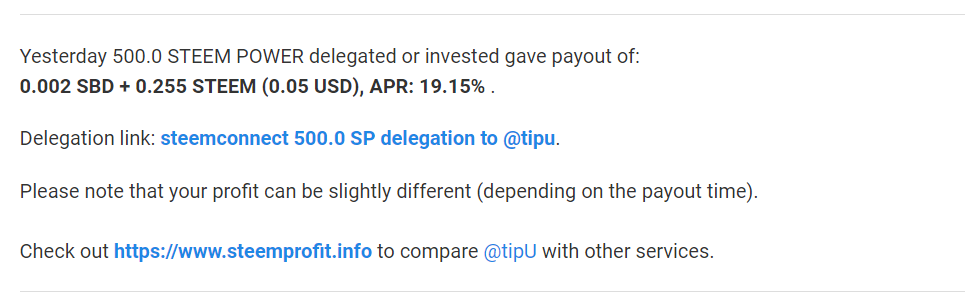 Not so long ago, the APR was about 33% but it seems that it went down by 10% now. For the sake of this discussion, let's use the current APR of 19.15%. It shows that Tipu's daily payout is about 0.05 USD worth of liquid tokens. Provided that the price of Steem will maintain the current value: