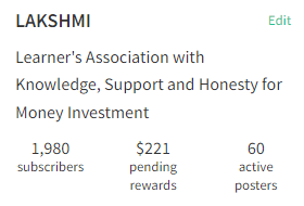 Now we have total 1980 members in LAKSHMI community with $221 pending rewards and 60 active posters. So become a part of this growing community and make your future bright and secure. Our moto is "Wealth and Happiness for All".