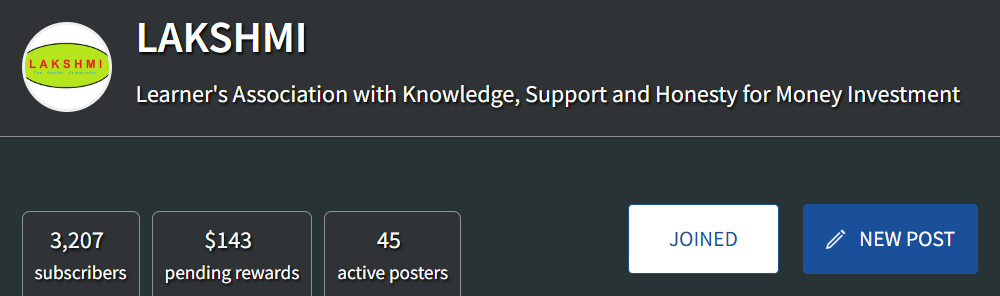 Now we have total 3207 members in LAKSHMI community with $143 pending rewards and 45 active posters. So become a part of this growing community and make your future bright and secure. Our moto is "Wealth and Happiness for All".