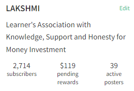 Now we have total 2714 members in LAKSHMI community with $119 pending rewards and 39 active posters. So become a part of this growing community and make your future bright and secure. Our moto is "Wealth and Happiness for All".