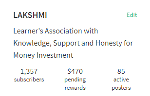 Now we have total 1357 members in LAKSHMI community with $470 pending rewards and 85 active posters. So become a part of this growing community and make your future bright and secure. Our moto is "Wealth and Happiness for All".