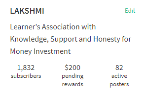 Now we have total 1832 members in LAKSHMI community with $200 pending rewards and 82 active posters. So become a part of this growing community and make your future bright and secure. Our moto is "Wealth and Happiness for All".