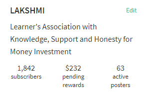 Now we have total 1842 members in LAKSHMI community with $232 pending rewards and 63 active posters. So become a part of this growing community and make your future bright and secure. Our moto is "Wealth and Happiness for All".