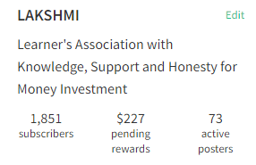 Now we have total 1851 members in LAKSHMI community with $227 pending rewards and 73 active posters. So become a part of this growing community and make your future bright and secure. Our moto is "Wealth and Happiness for All".