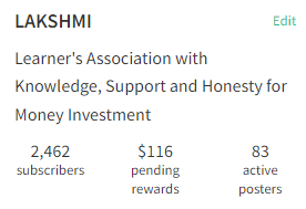 Now we have total 2462 members in LAKSHMI community with $116 pending rewards and 83 active posters. So become a part of this growing community and make your future bright and secure. Our moto is "Wealth and Happiness for All".