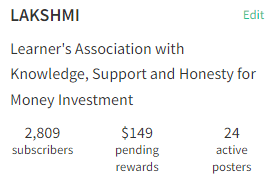Now we have total 2809 members in LAKSHMI community with $149 pending rewards and 24 active posters. So become a part of this growing community and make your future bright and secure. Our moto is "Wealth and Happiness for All".