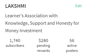 Now we have total 1740 members in LAKSHMI community with $280 pending rewards and 56 active posters. So become a part of this growing community and make your future bright and secure. Our moto is "Wealth and Happiness for All".
