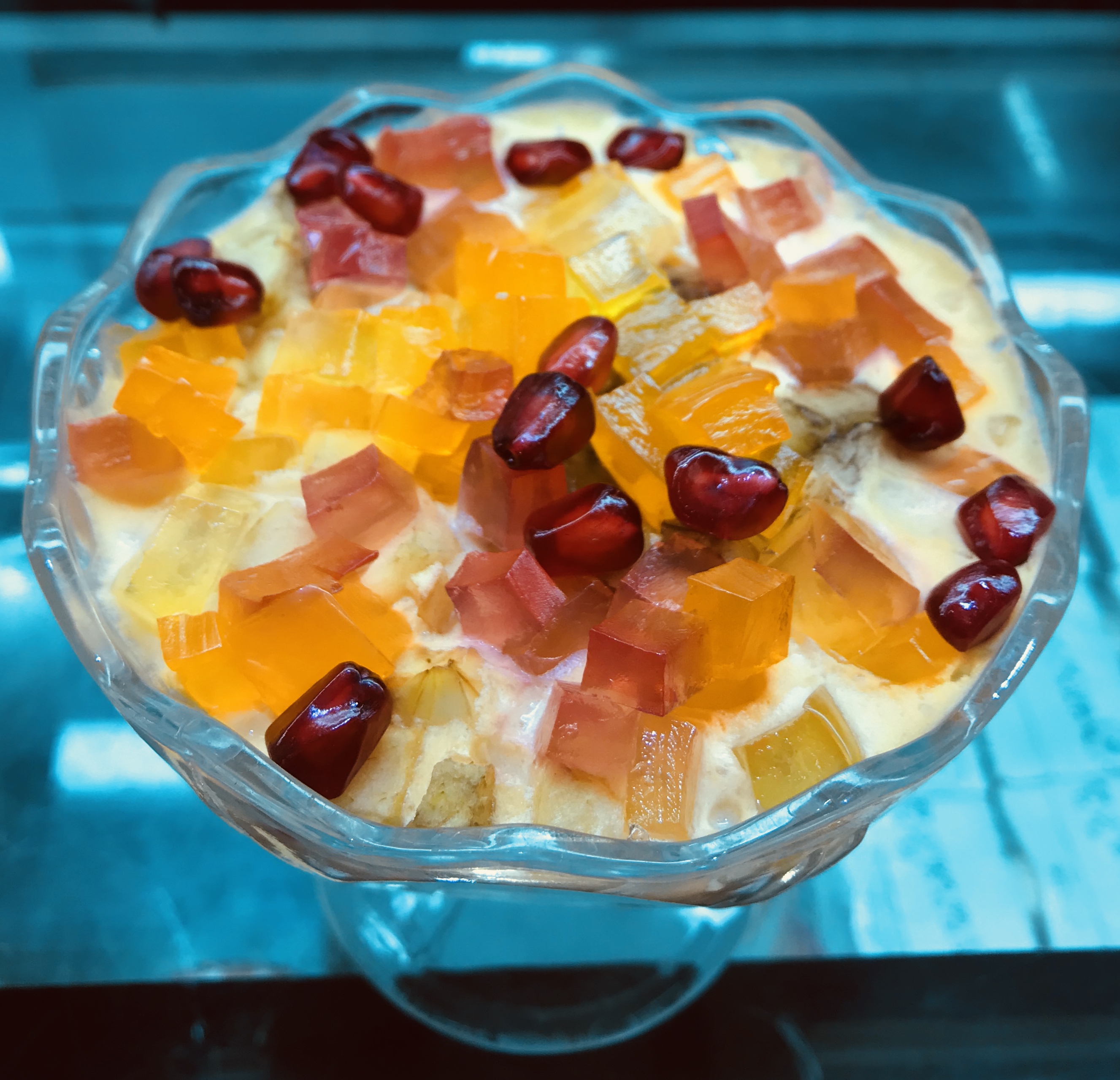 We have a lot of fun faluda yoghurt here with some pomegranate pieces made with marmalade.