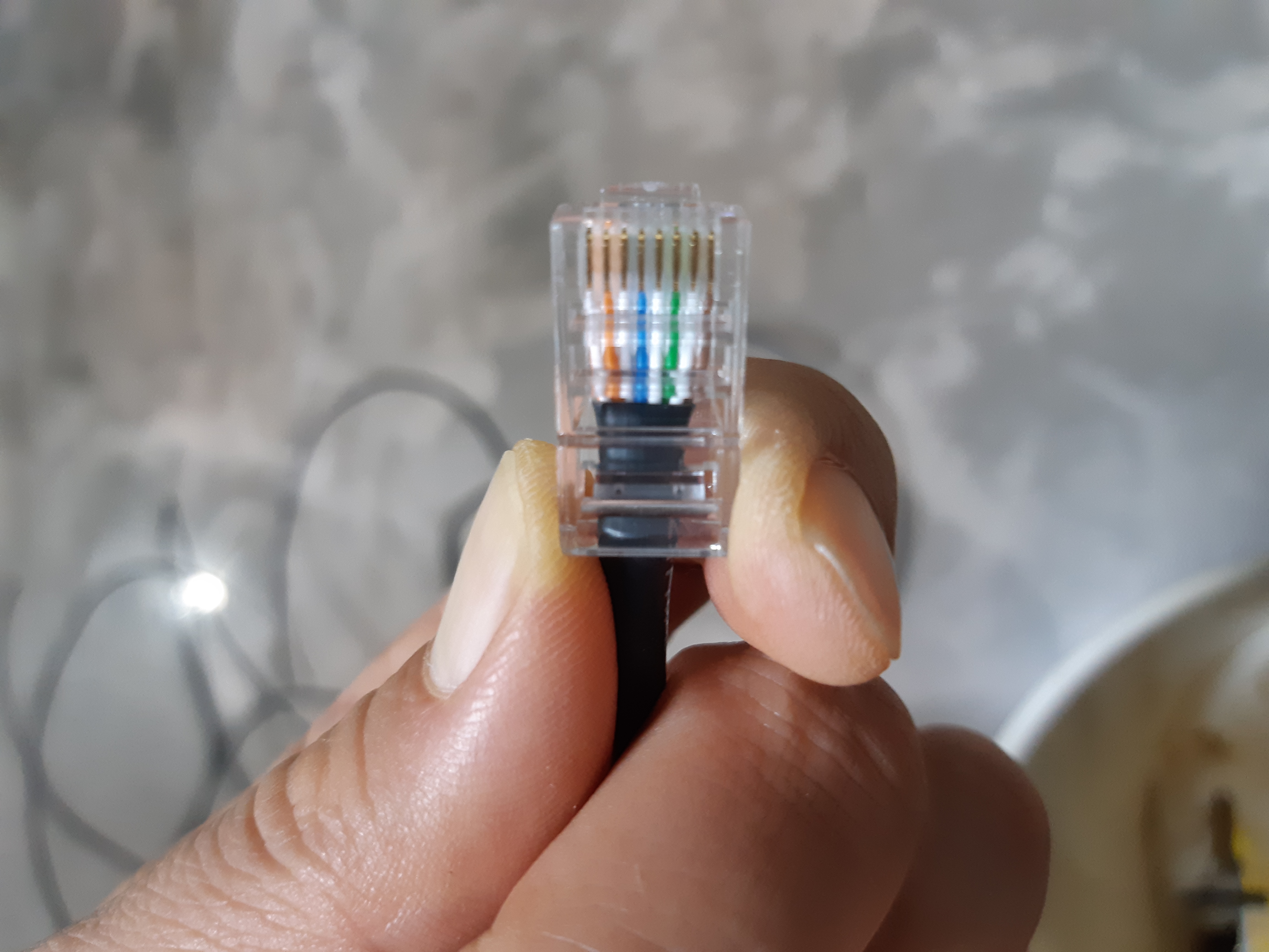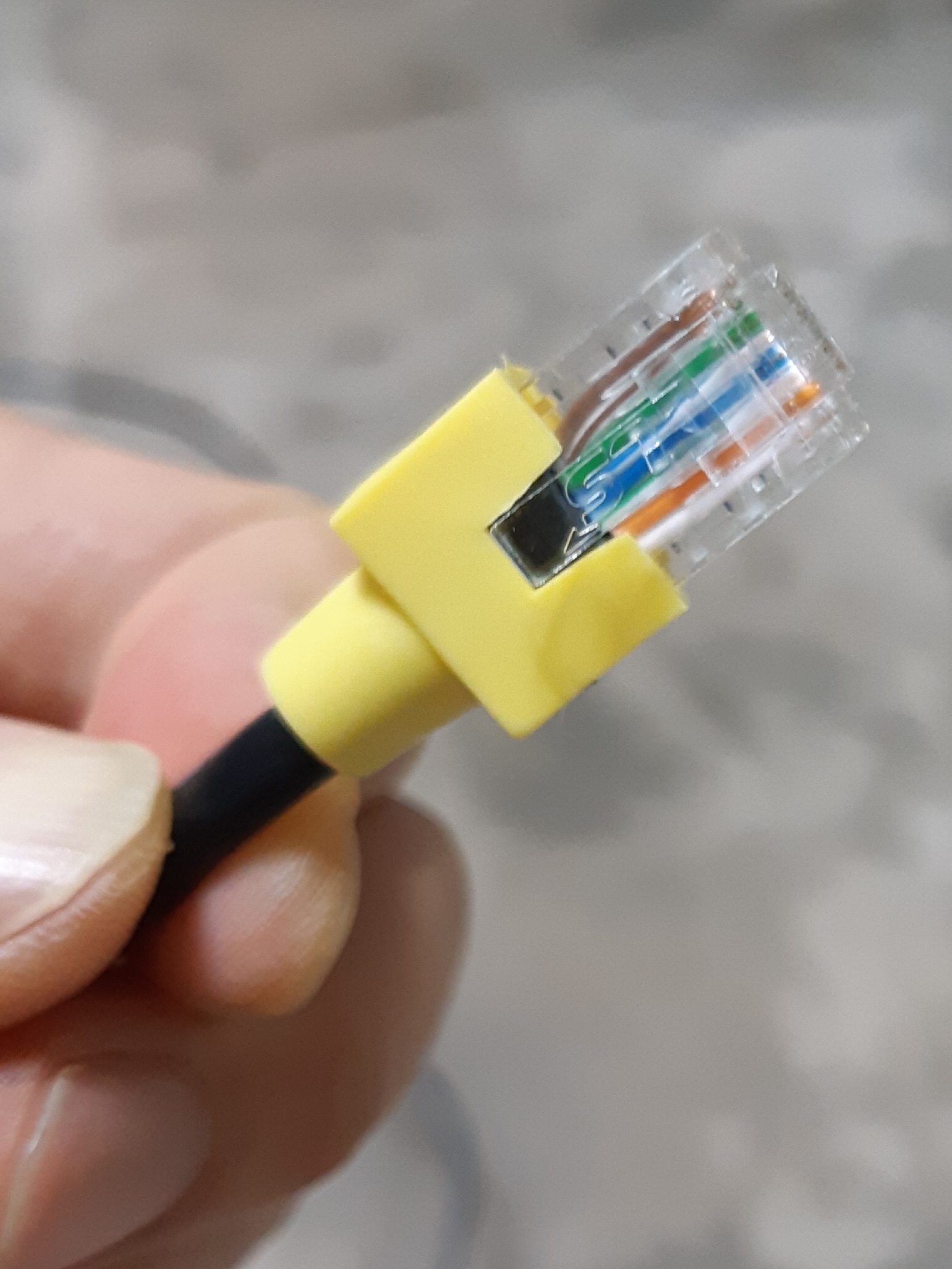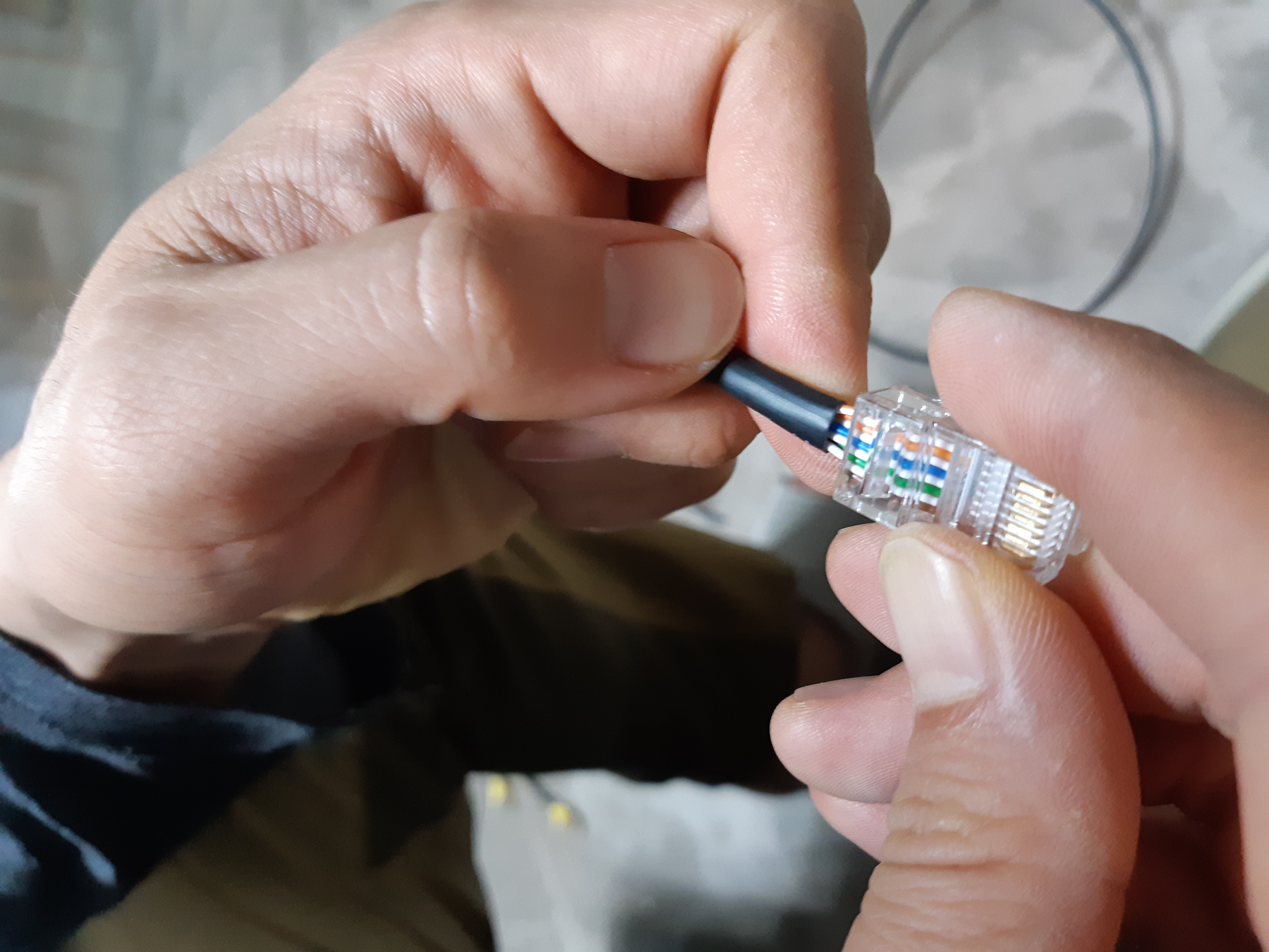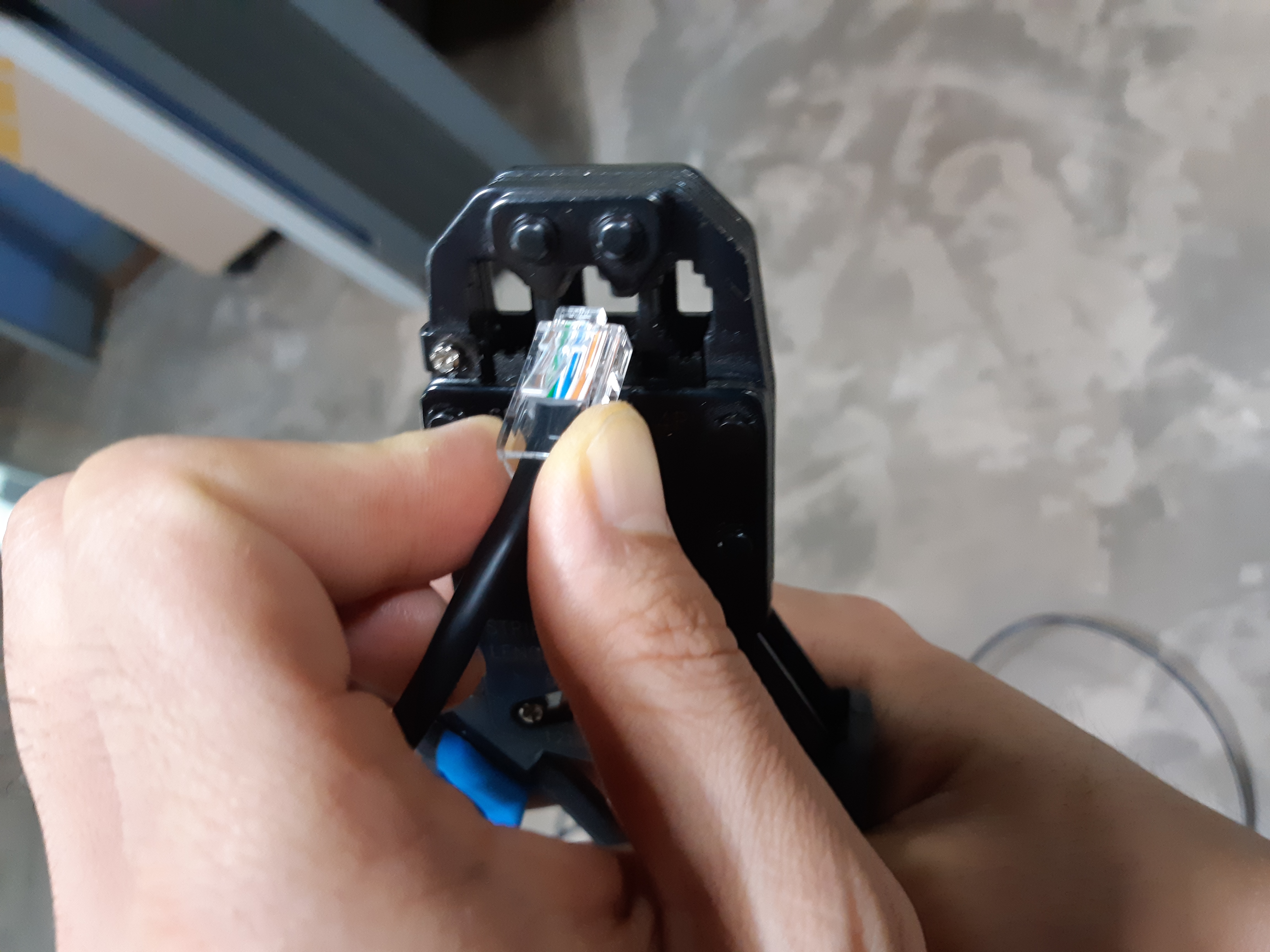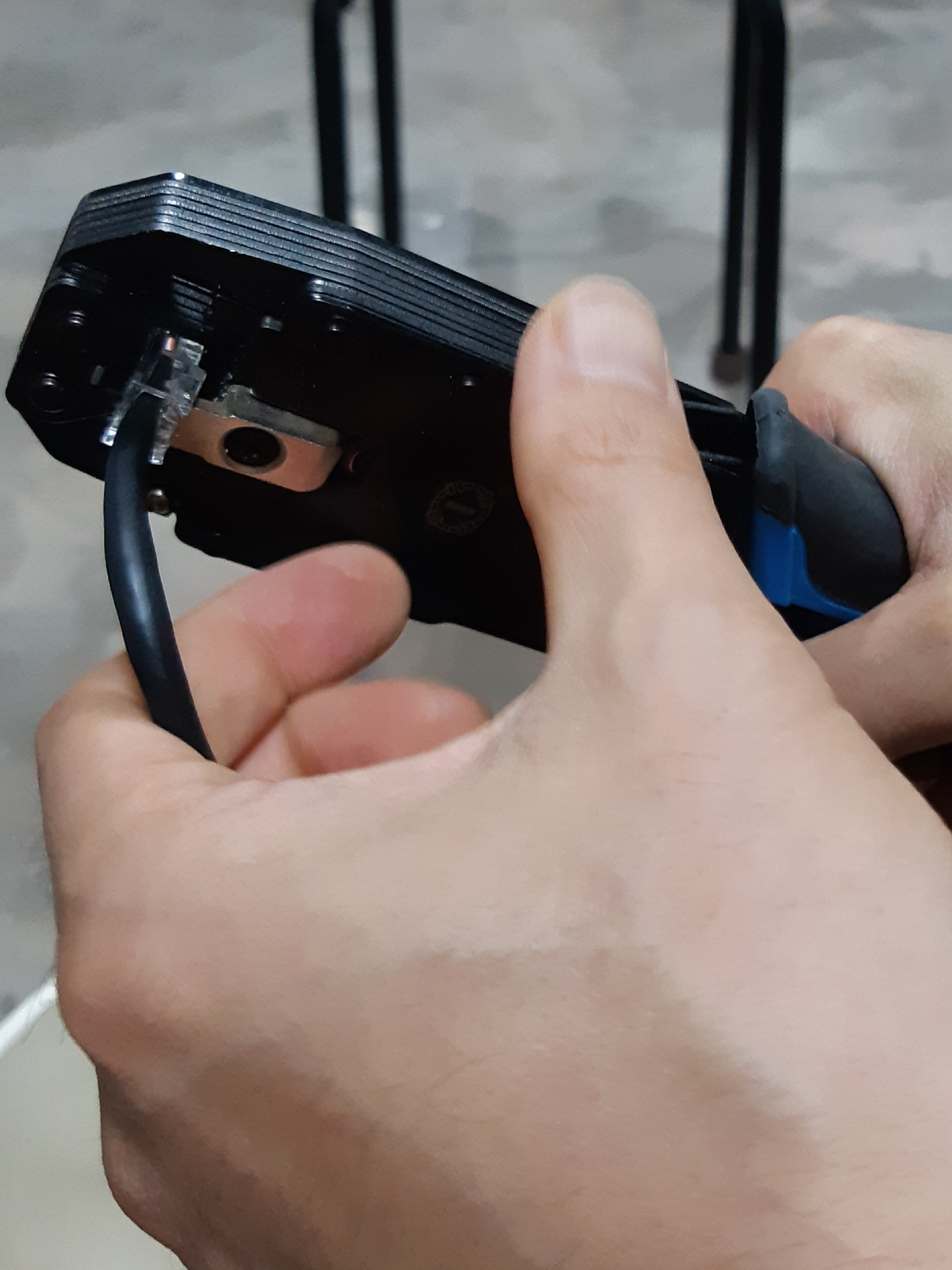 랜툴에 선이 연결된 RJ45 커넥터를 넣고 꽉 고정시켜줍니다