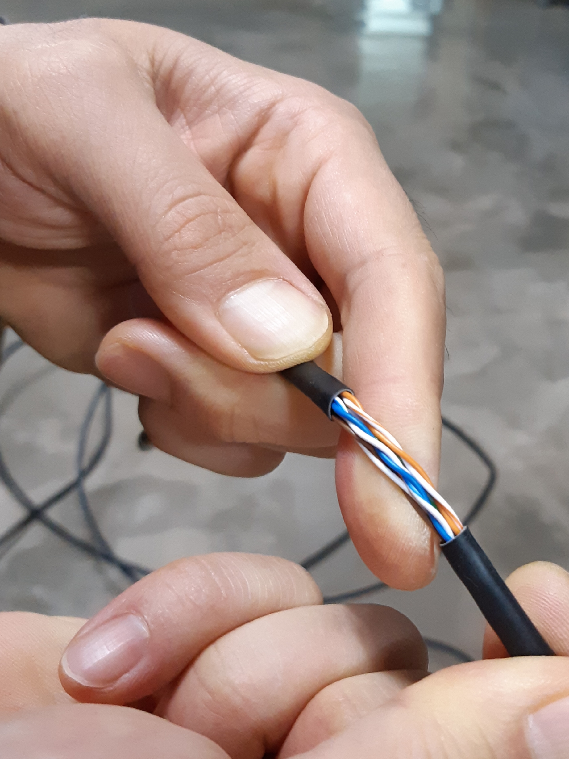 The LANcable should be gently spun away from the first hole in the LANcable sheather as shown below.