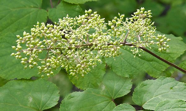 Aralia racemosa, also called American spikenard, is a shrub. It grows 3 to 5 feet tall. People also know it as little rose or Indian root.