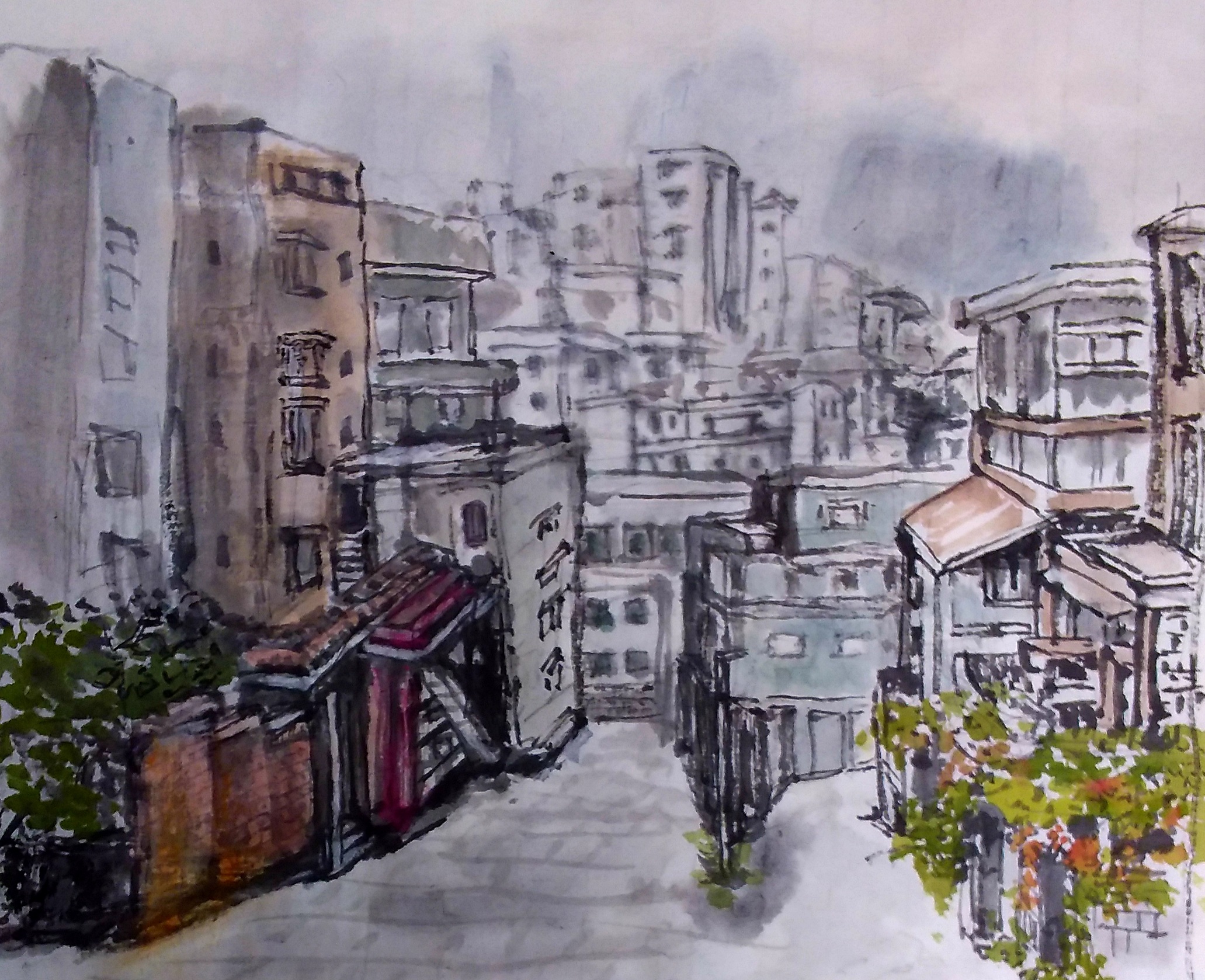 That is like in center of a modern city. A lot of blockhouses. I like the green plants in front, they lighten up the painting.