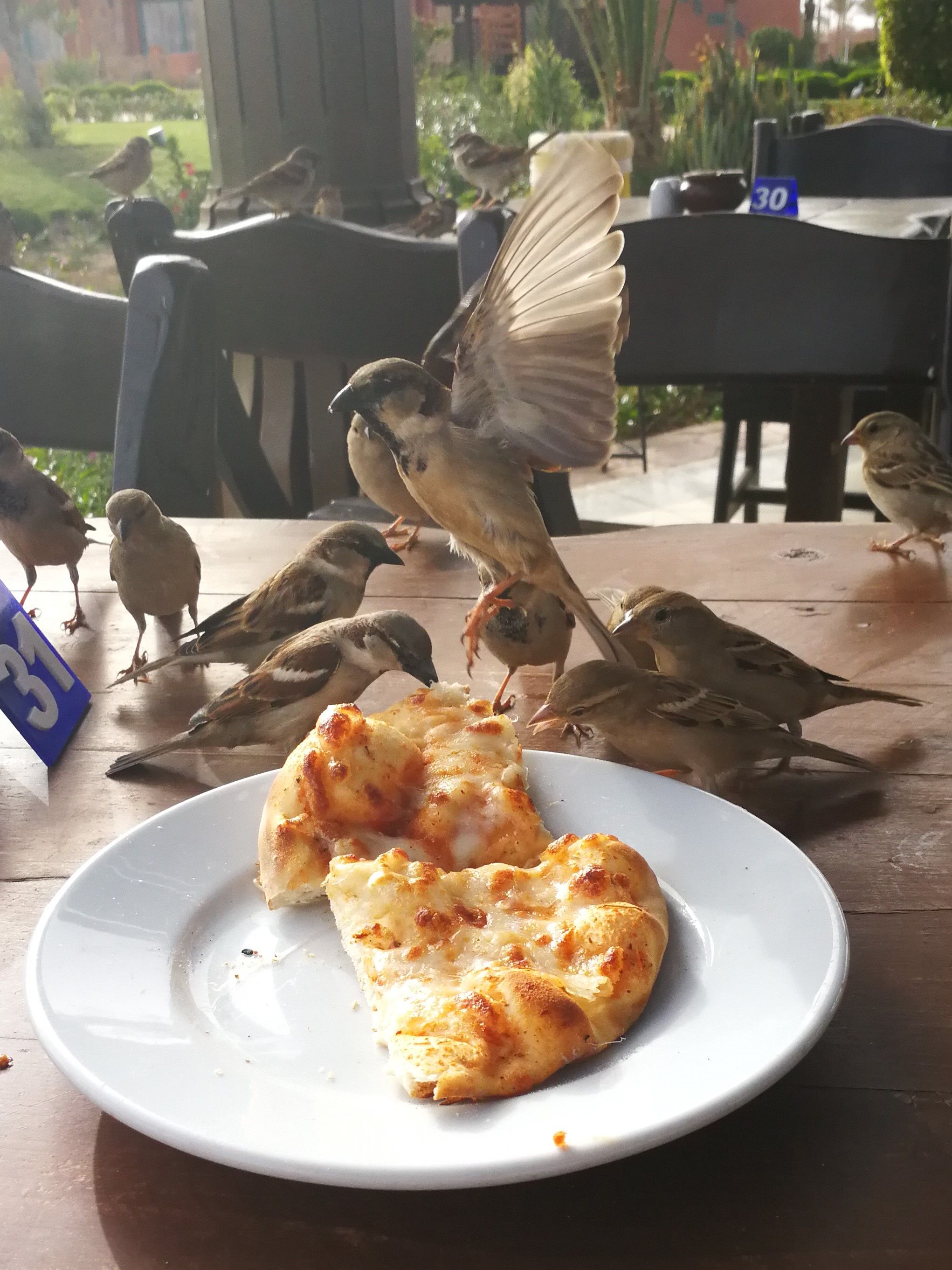 Es gab durchgängig kleinere snacks wie z.B. Pizza. Dieß lockte jedemenge kleine freche Spatzen an. Gerne habe ich meine Pizza mit ihnen geteilt :)