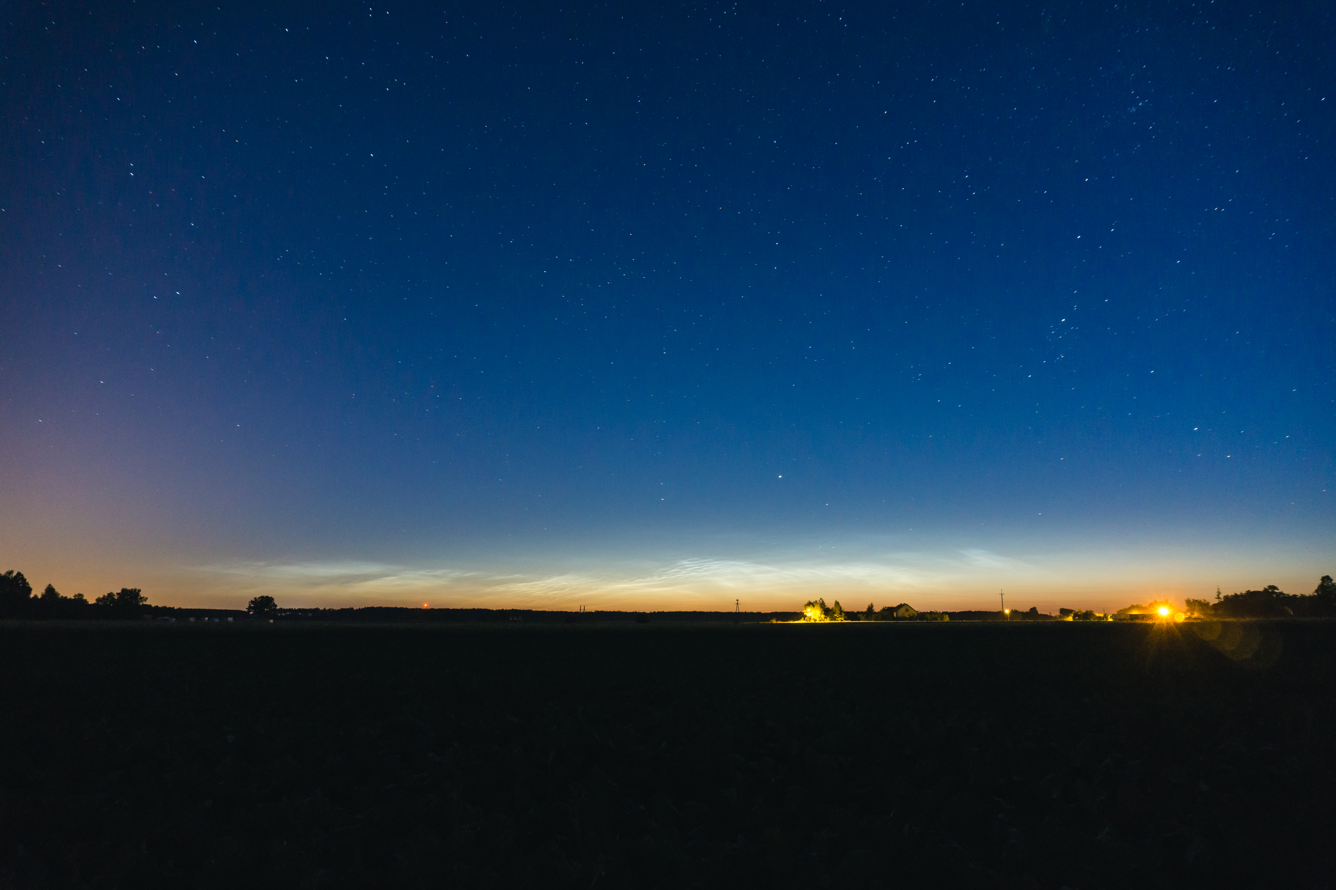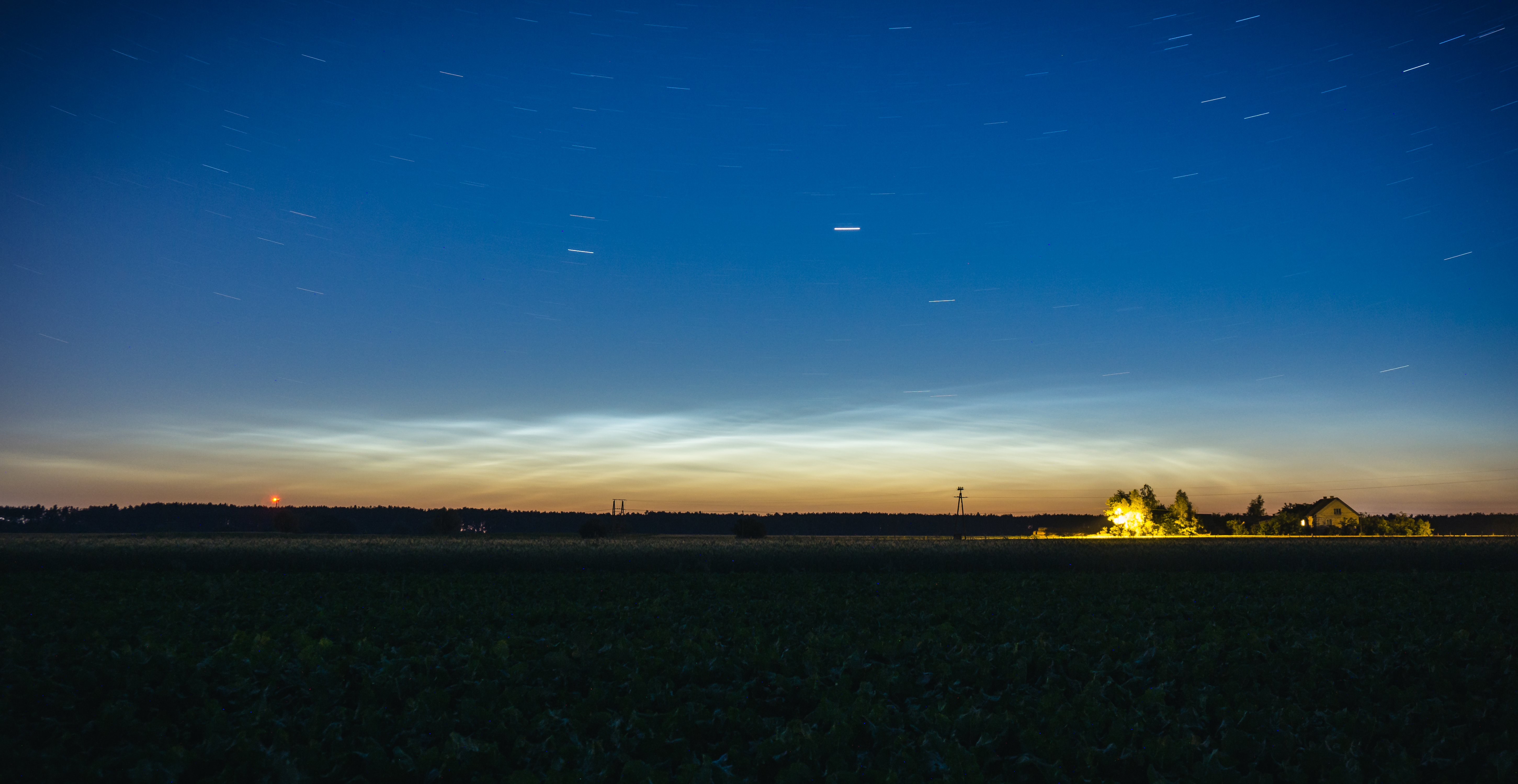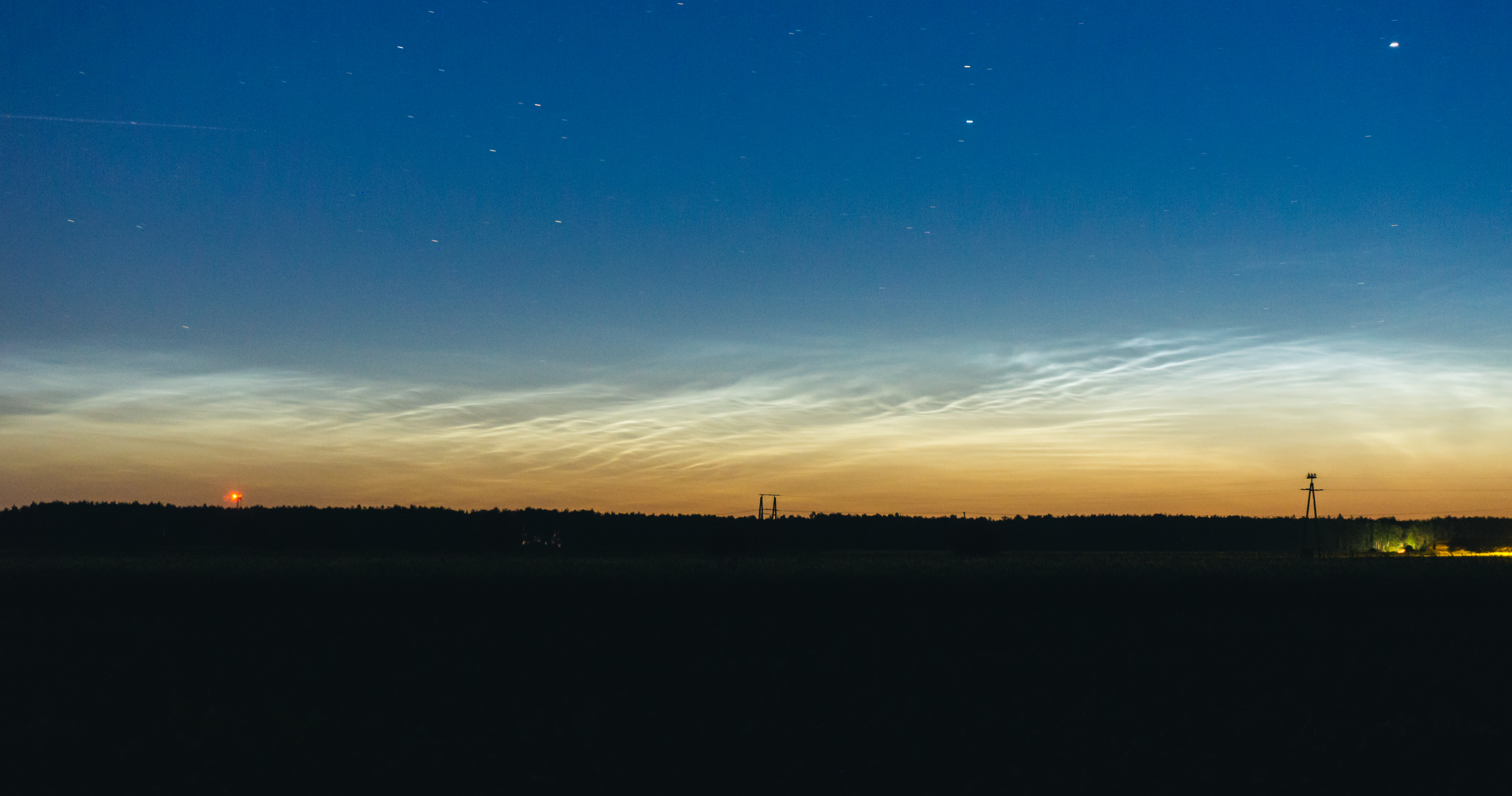 Wikipedia: Noctilucent clouds, or night clouds, are tenuous cloud-like phenomena in the upper atmosphere of Earth. They consist of ice crystals and are only visible during astronomical twilight. Noctilucent roughly means "night shining" in Latin. They are most often observed during the summer months from latitudes between 50° and 70° north and south of the Equator. They are visible only during local summer months and when the Sun is below the observer's horizon, but while the clouds are still in sunlight.
