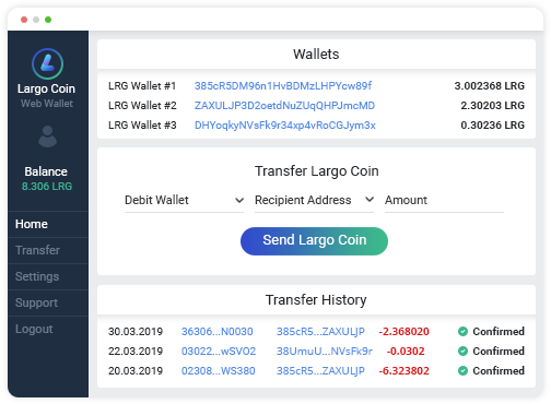 Largo Foundation has developed its sophisticated multi-platform software. At present, Largo Wallet is available in desktop, mobile and web versions, all of which ensure comfortable use, easy transfer, level of security and financial sovereignty from Largo Coin holders. Largo Wallet is more prominent than other wallet solutions with a seamless user experience and smooth operation. Thanks to the infrastructure that supports Largo Wallet, this wallet is available to everyone for free 24 hours a day, 365 days a year.