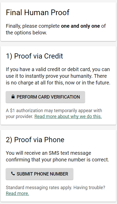 이것은 우리가 보상 프로그램에 참여하기 위해 신용 카드가 필요한 이유입니다. 우리가 당신이이 단계가없는 진정한 사람이라고 말할 수 있었으면 좋지만, 지금까지 시도한 다른 해결책은 잘 작동하지 않았습니다. 귀하의 신원을 확인하는 가장 빠르고 쉬운 방법입니다. 그렇지 않은 경우 아래를 참조하십시오.