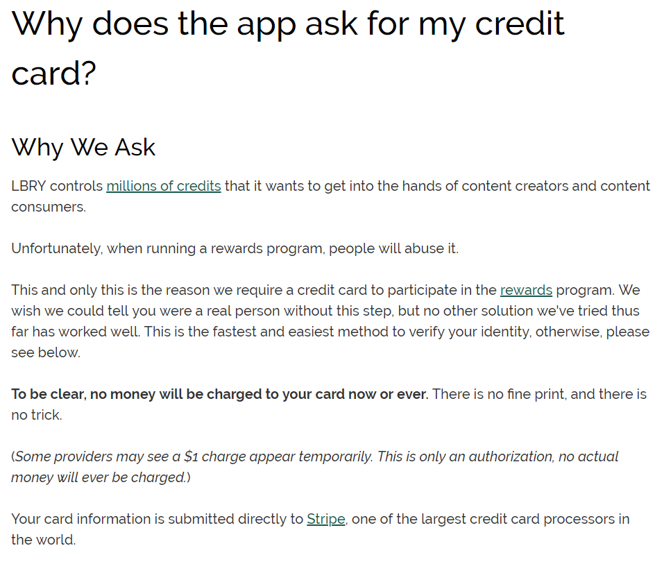 신용카드 정보를 묻는 이유에 대해 LBRY 는 위와 같이 명시해놓고 있습니다.