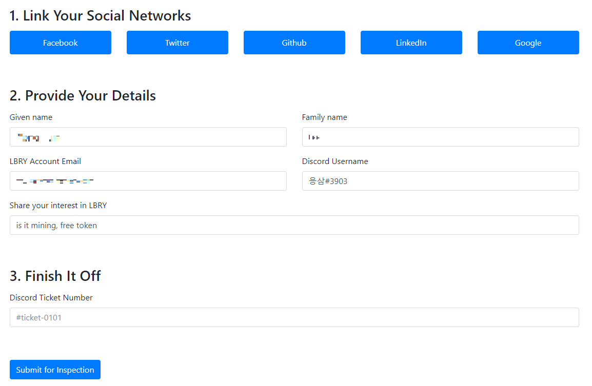 그럼 이렇게 소셜인증 및 신원정보를 입력하라고 나옵니다.