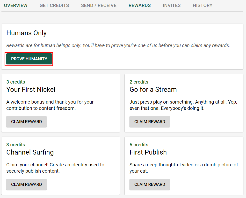 LBRY 베타 참여에 대한 무료 보상으로 30 크레딧을 포함하여 크레딧을받는 다양한 방법이 있습니다.