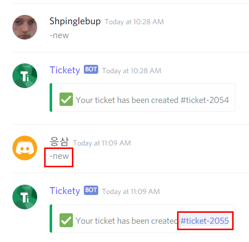 채팅방에서 -new 라고 입력하면 이렇게 티켓번호를 알려줍니다.
