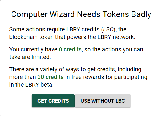 일부 작업에는 LBRY 네트워크에 필요한 블록 체인 토큰 인 LBRY 크레딧 (LBC)이 필요합니다.