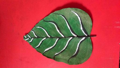 In China or India, leaf painting is made by drawing onto leaf of a number of plants. In this case, leaf play the role as drawing-paper, artists still have to use paint to finish their art-works. A basic drawback of this art form is: Leaf size is limited so that it will restrict the creative power of artists who require a bigger ground for their art-works.