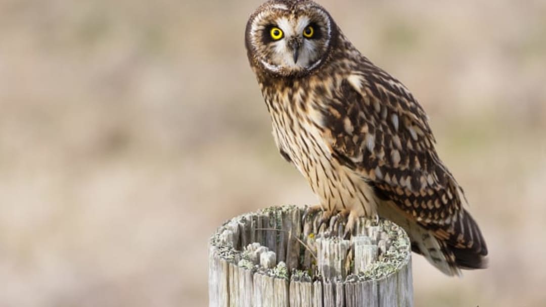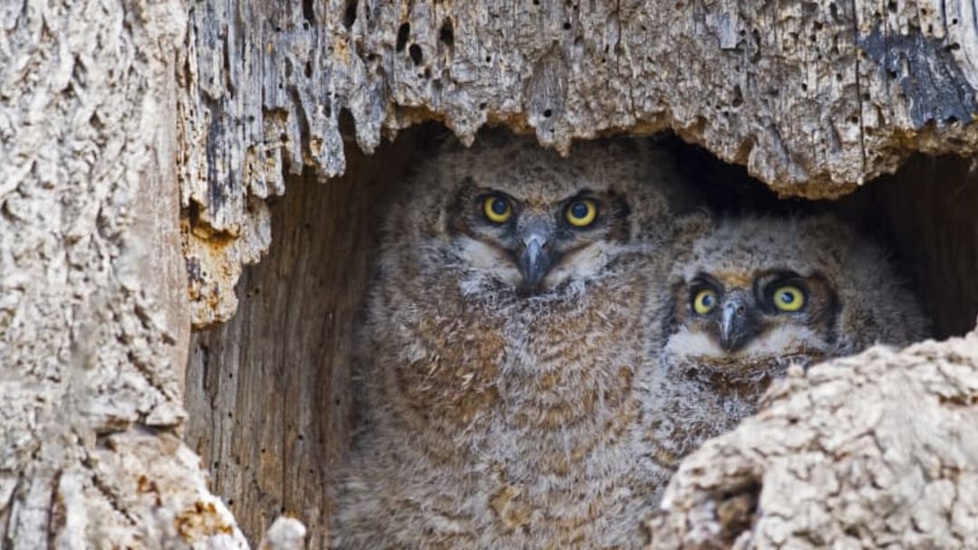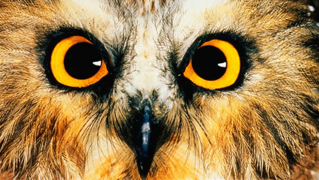 Instead of spherical eyeballs, owls have "eye tubes" that go far back into their skulls—which means their eyes are fixed in place, so they have to turn their heads to see. The size of their eyes helps them see in the dark, and they're far-sighted, which allows them to spot prey from yards away. Up close, everything is blurry, and they depend on small, hair-like feathers on their beaks and feet to feel their food.
