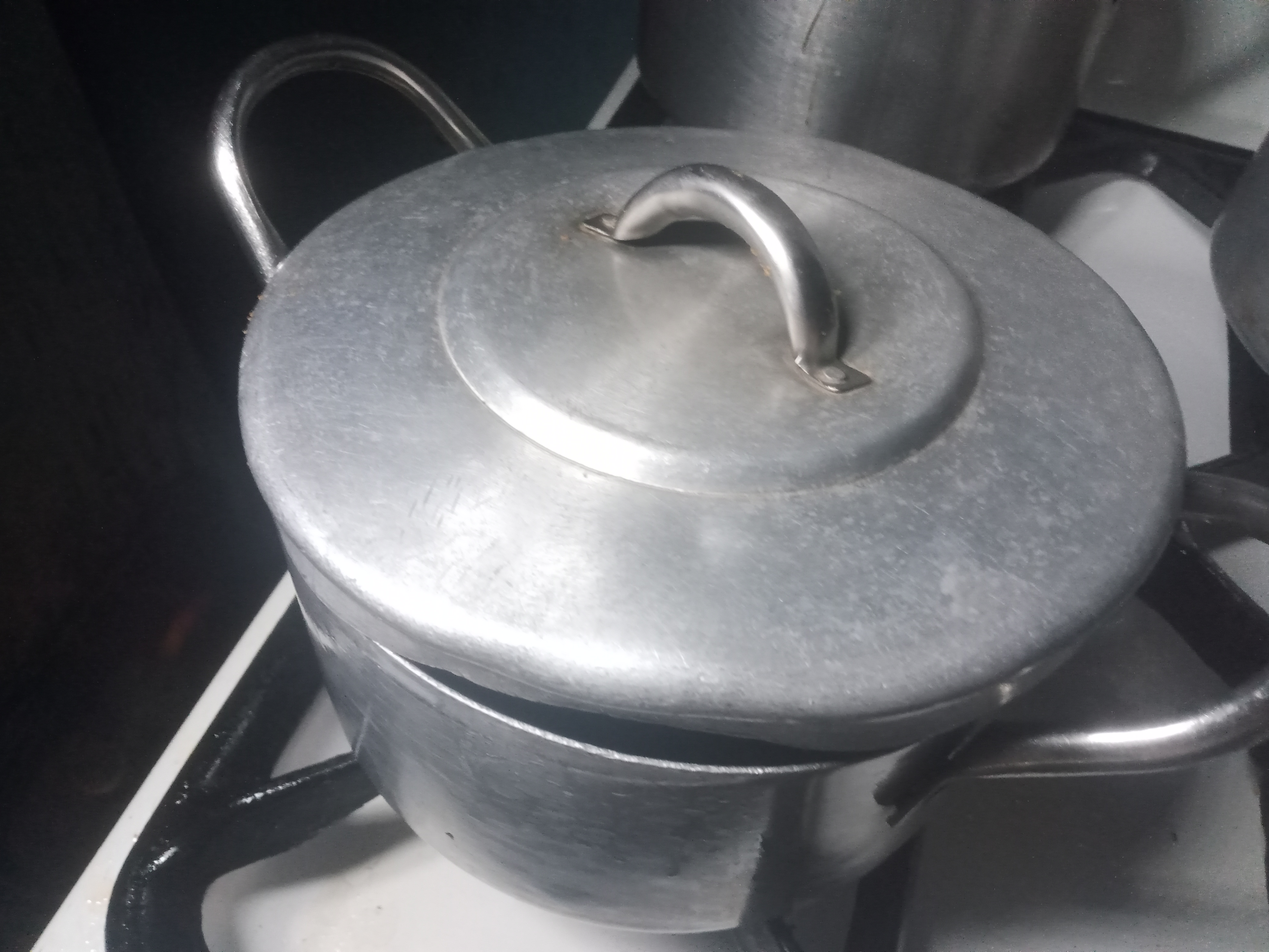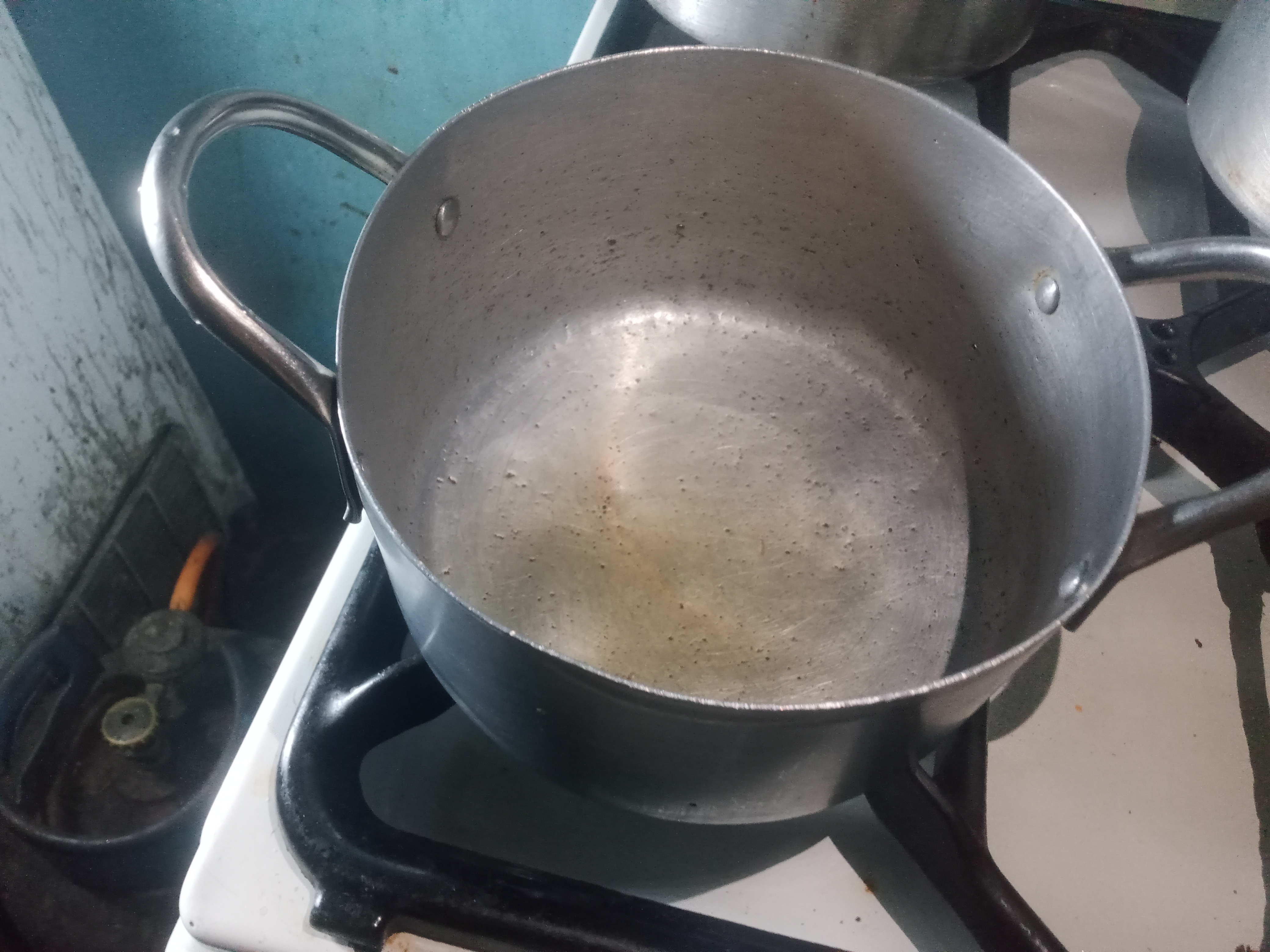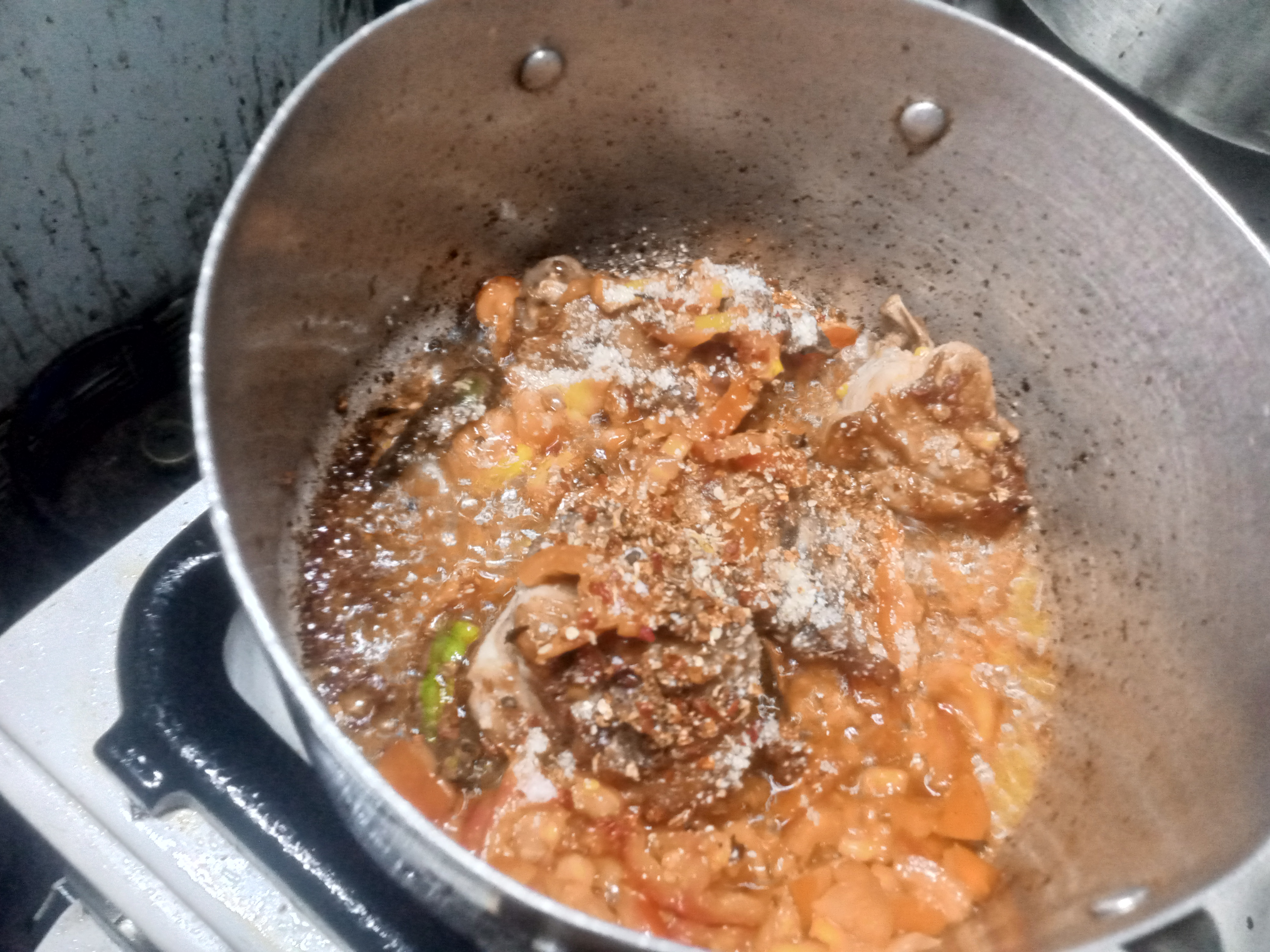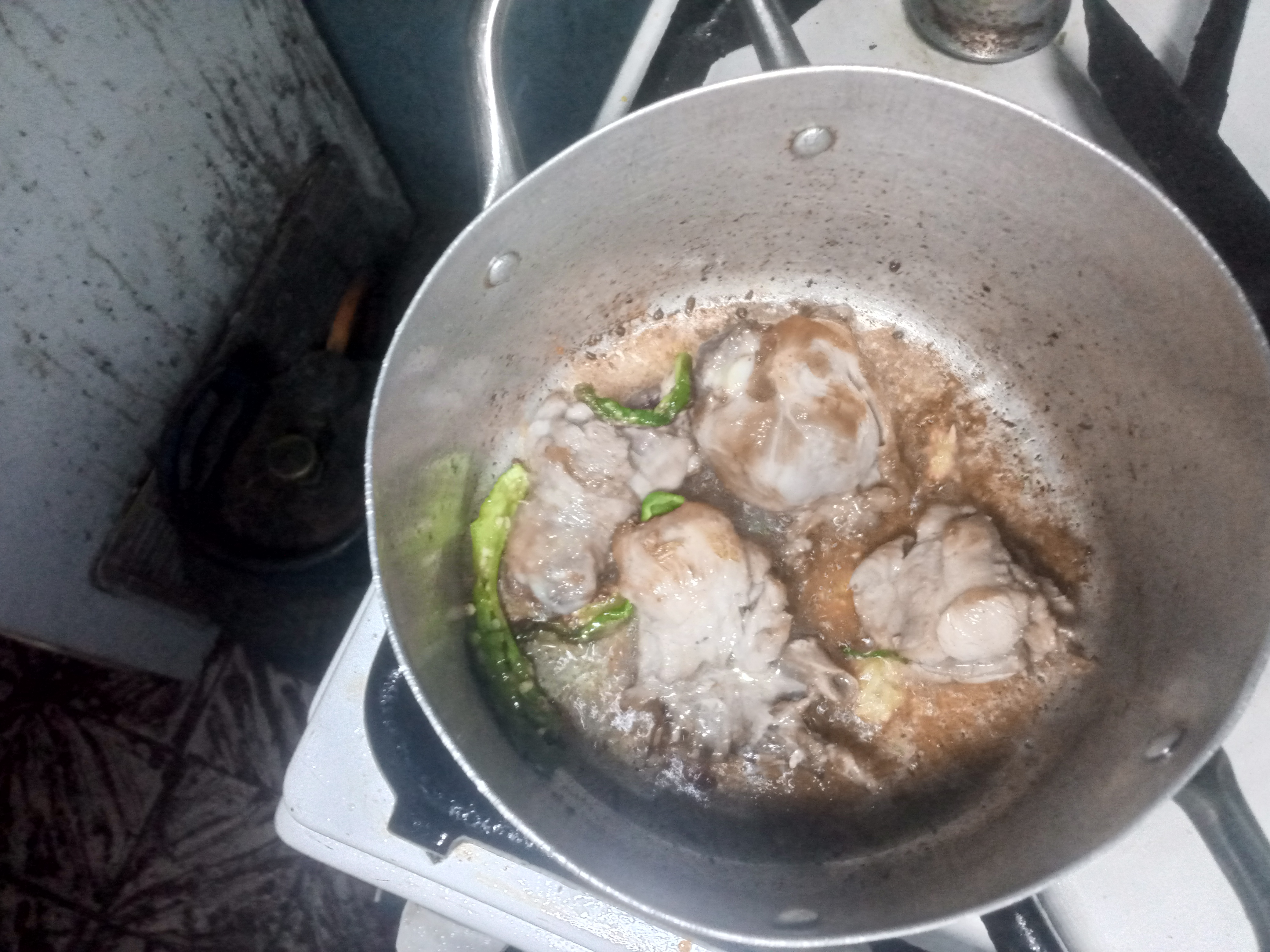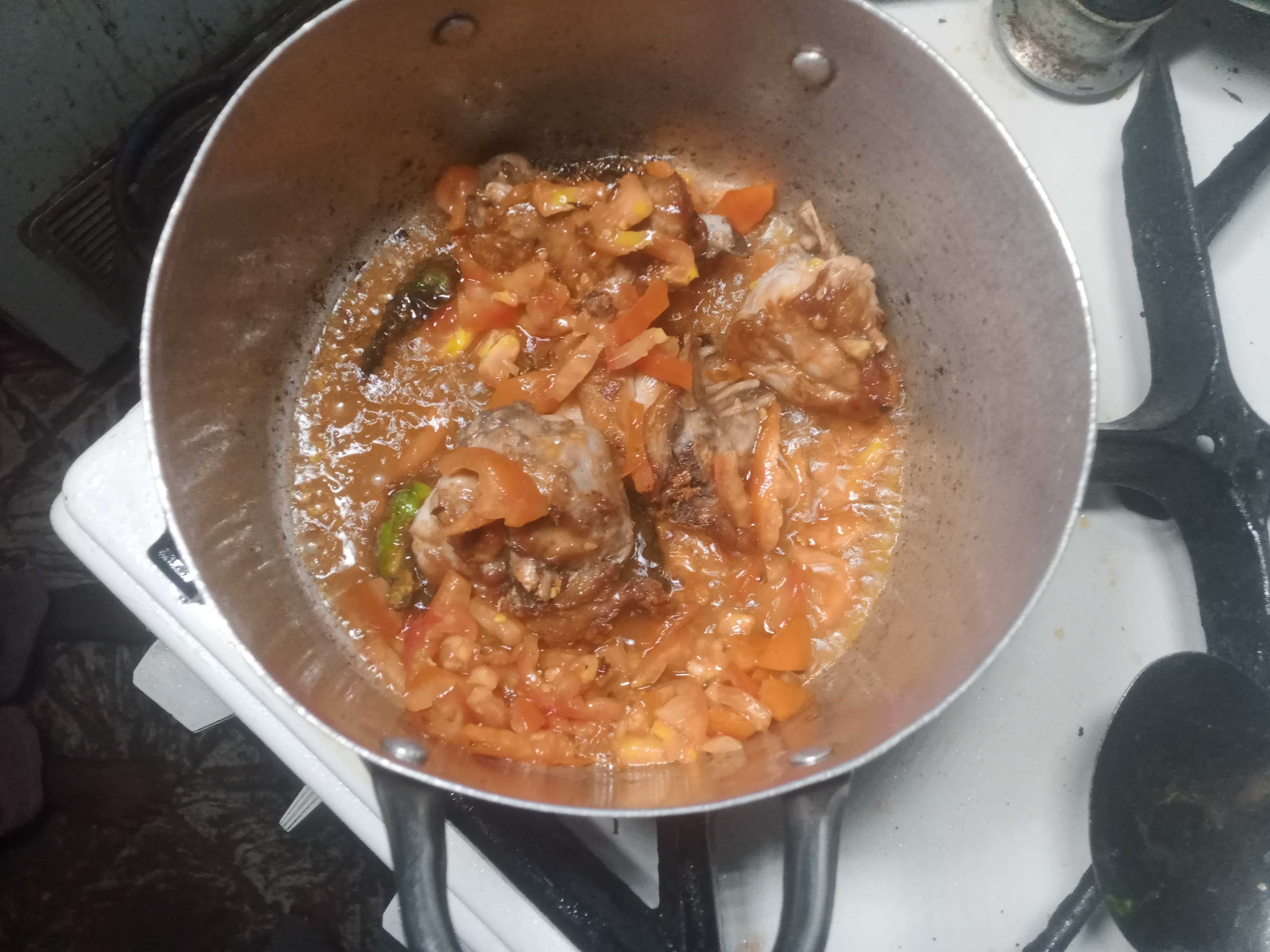 I put on my cooking gas, and placed my pot, then poured oil on the pot and put my chicken and fry; after 5-10 minutes, I put some green chilli, cumin, coriander and tomatoes.